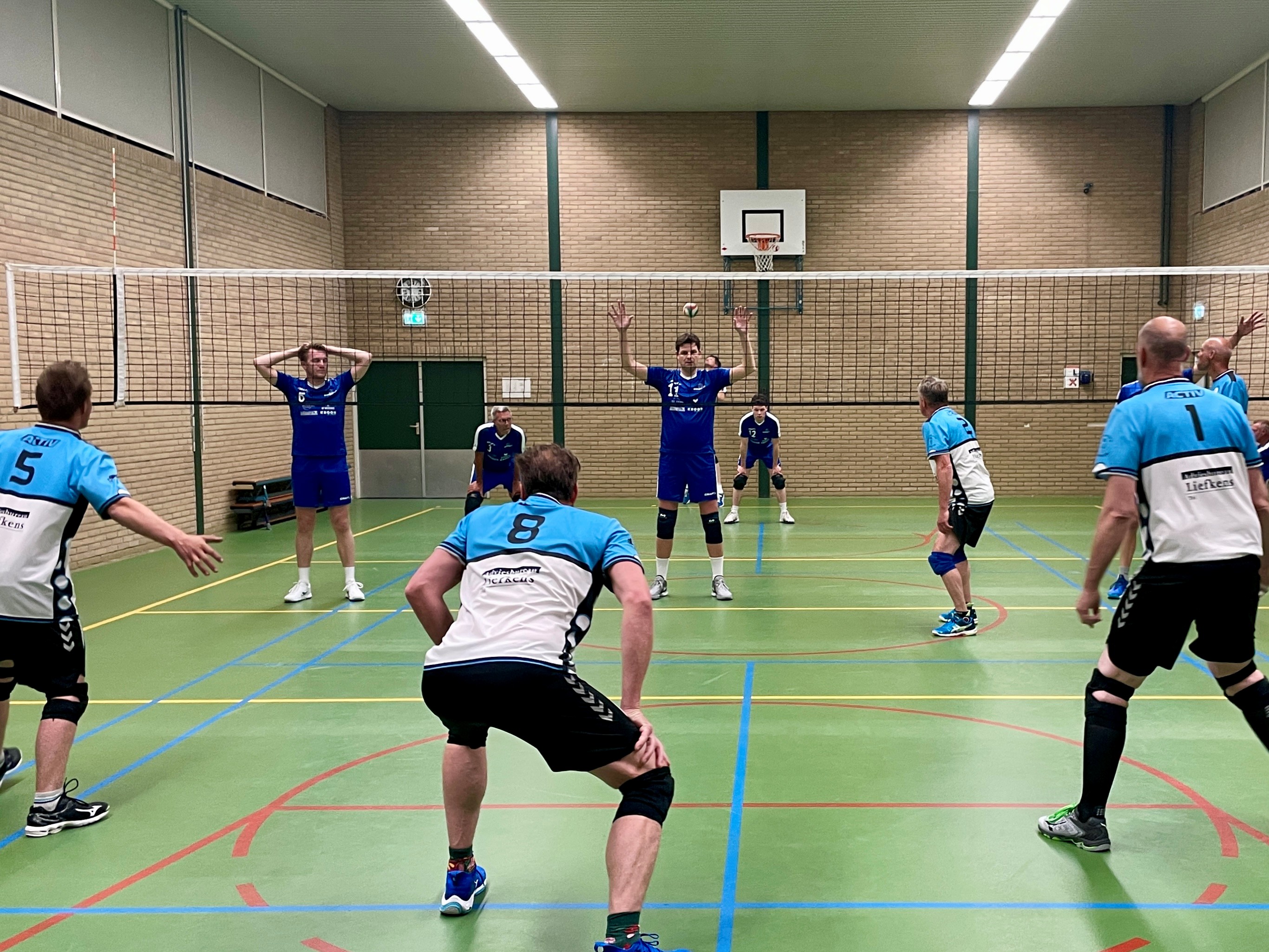 2. Bij de opslag mag de serverende partij niet schermen: er dient a) minimaal 1 armlengte onderlinge afstand aangehouden te worden en b) armen mogen niet boven het hoofd geheven worden. Zie hoofdfoto: hier zal dit seizoen dus voor afgefloten worden, de middenman heeft zijn armen boven zijn hoofd. De rechtsvoor heeft zijn armen achter zijn hoofd, dat is wel toegestaan. Wordt er na een waarschuwing toch weer geschermd, gaat het punt naar de tegenstander.