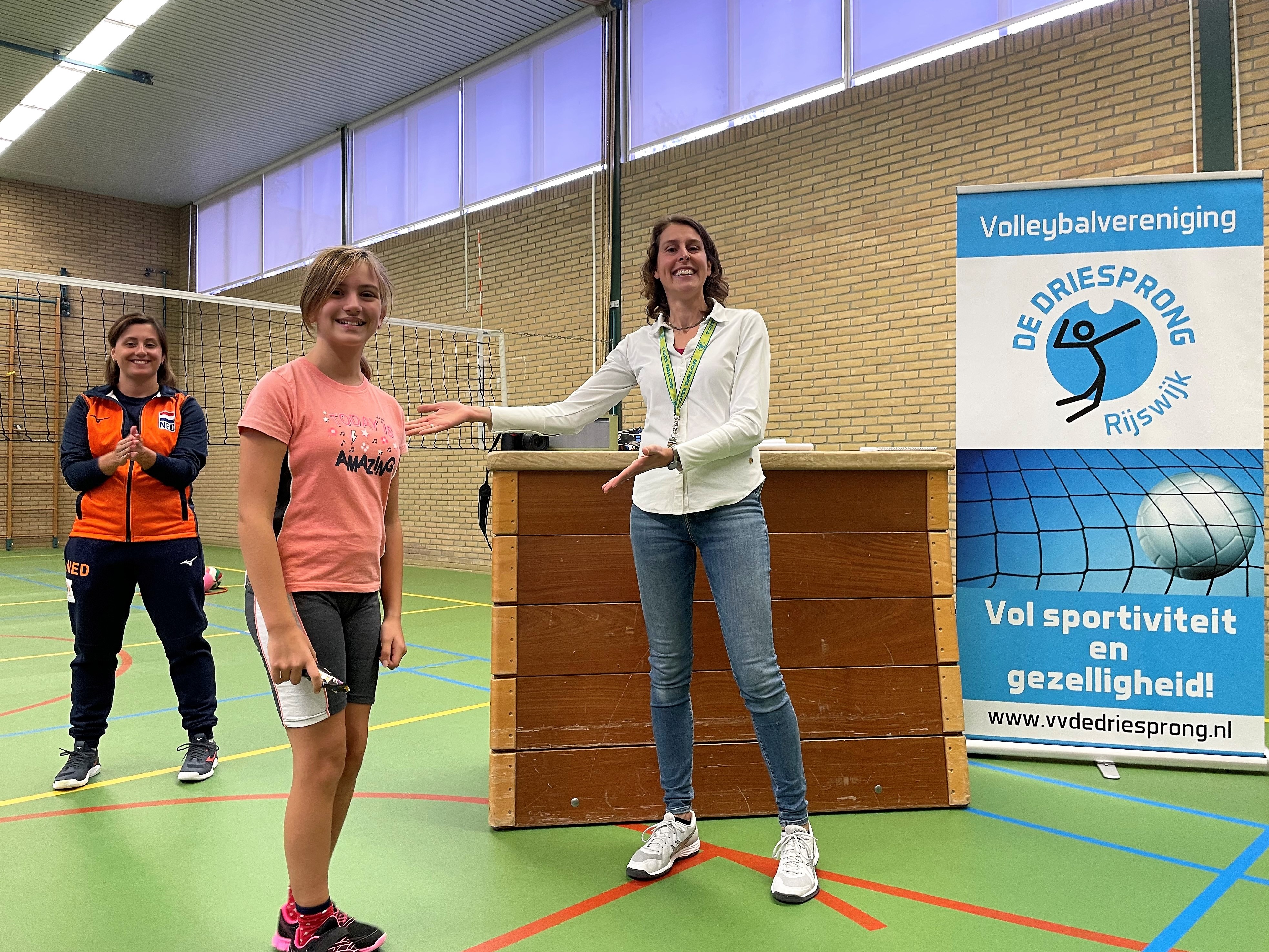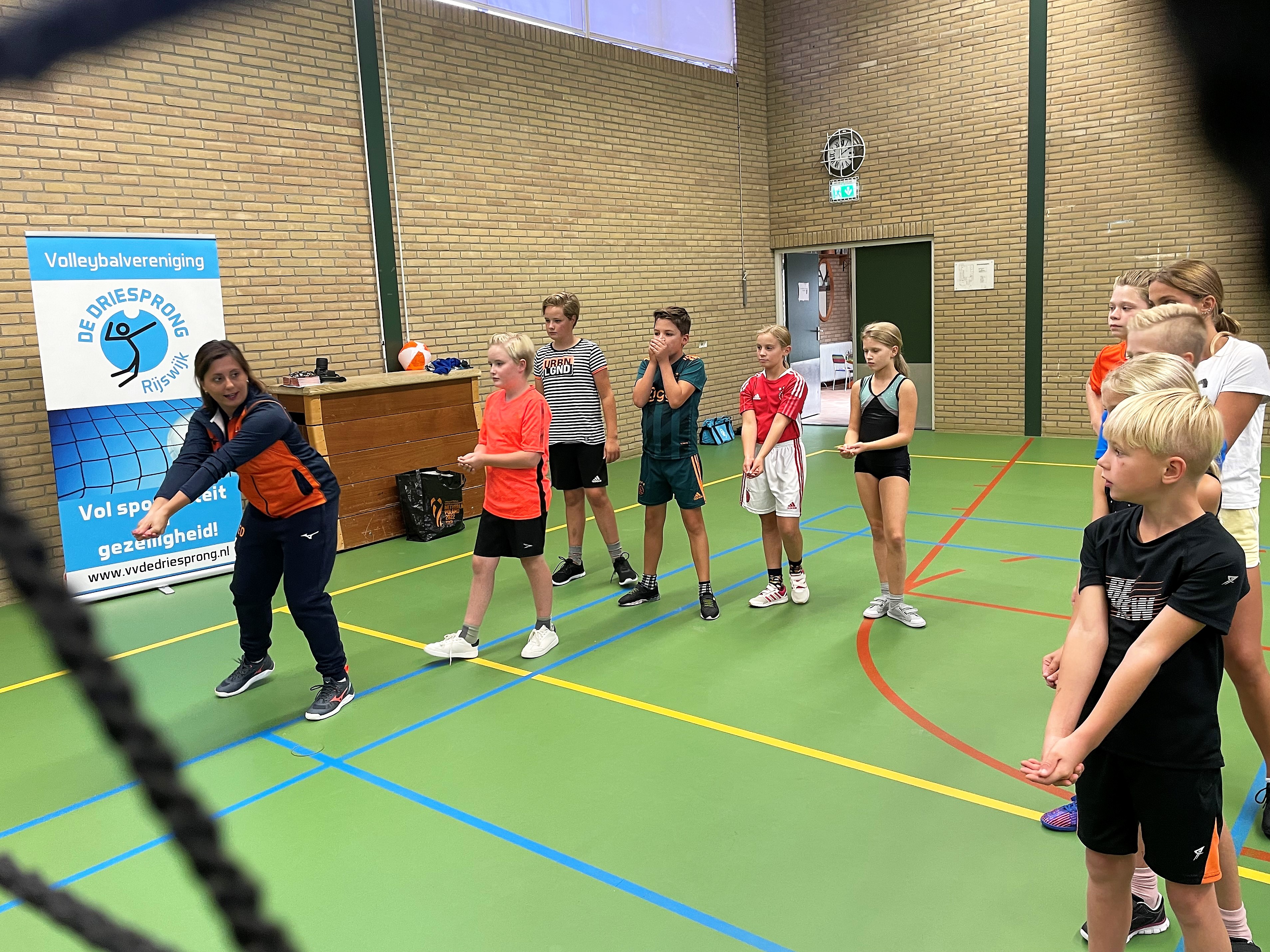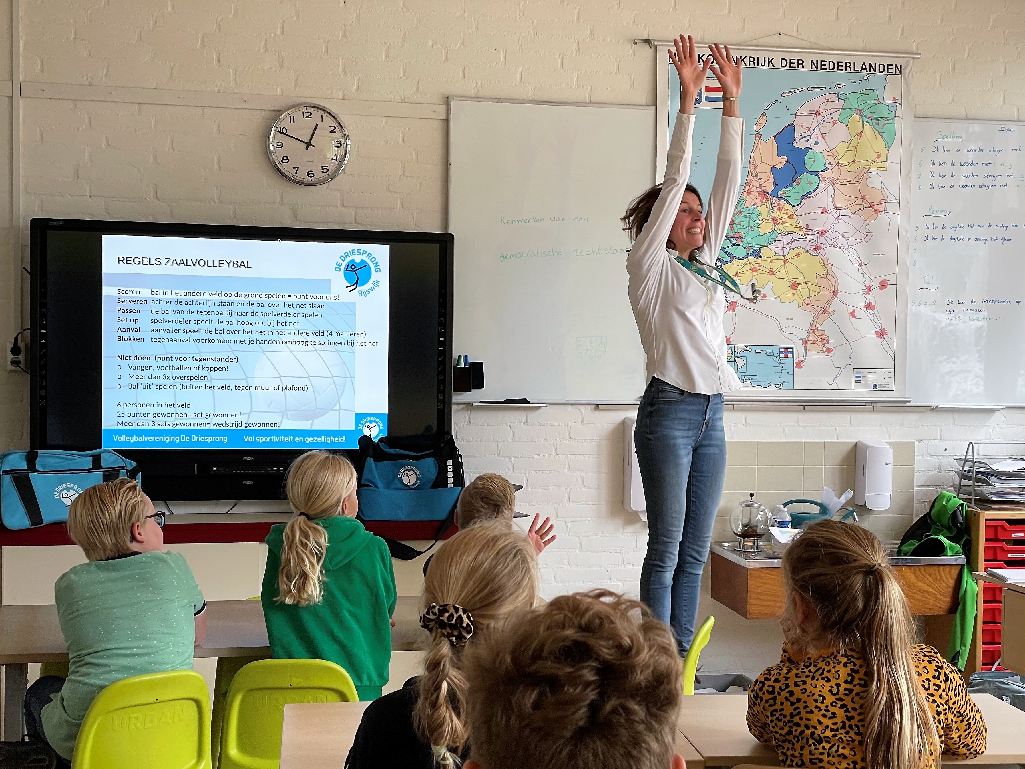 Vervolgens vertelde Annet over welke typen volleybalspellen er zijn, en legde ze al springend de spelregels van volleybal uit. Als voormalig basisschooljuf was ze weer helemaal in haar element!