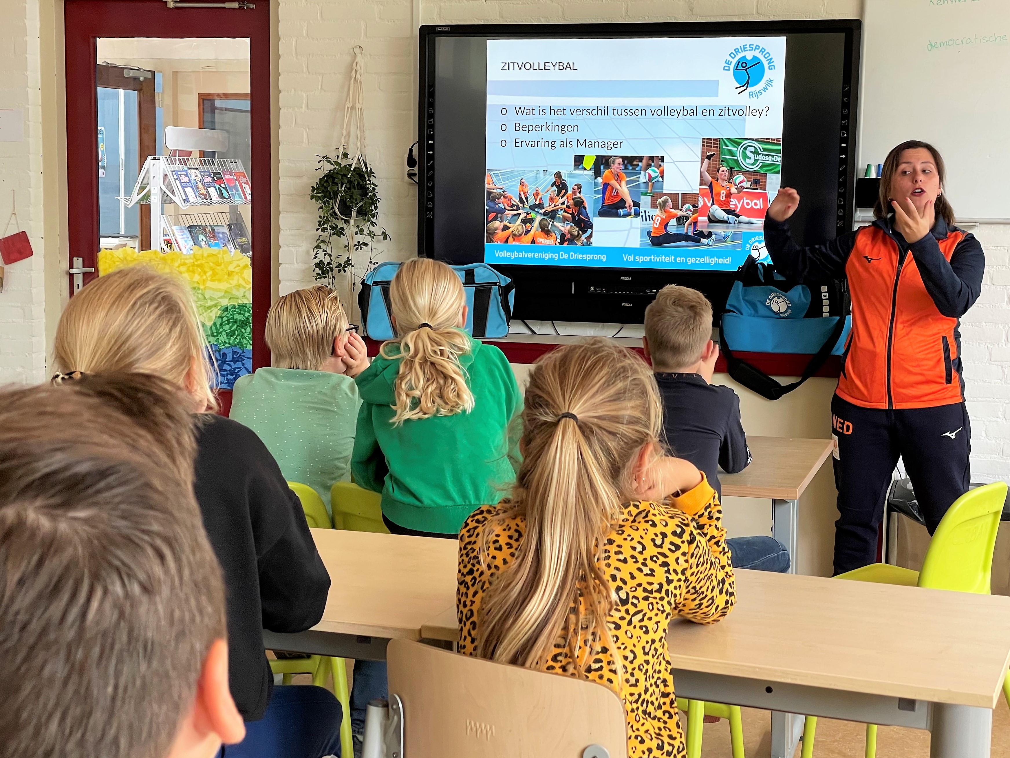 Daarna mocht Chantal uitleggen wat haar functie als Nevobo-manager van het nationale Nederlandse zitvolleybalteam inhoud, en waar ze over de wereld al geweest was. Dat vonden de leerlingen prachtig, maar wat ze ook enorm boeide was topsport met een handicap; slechts 1 been, geen vingers, et cetera.... dat vonden ze bijzonder interessant!