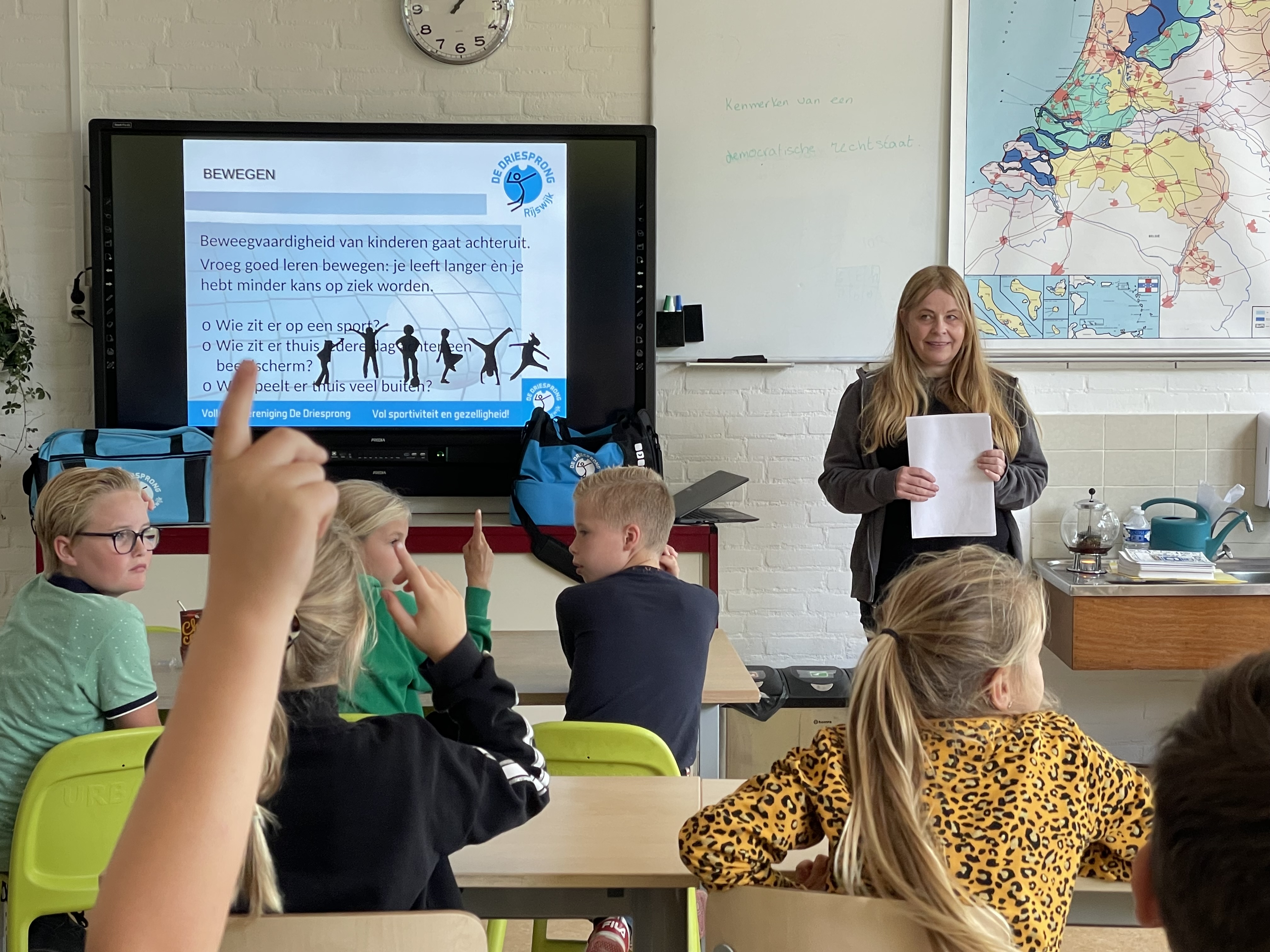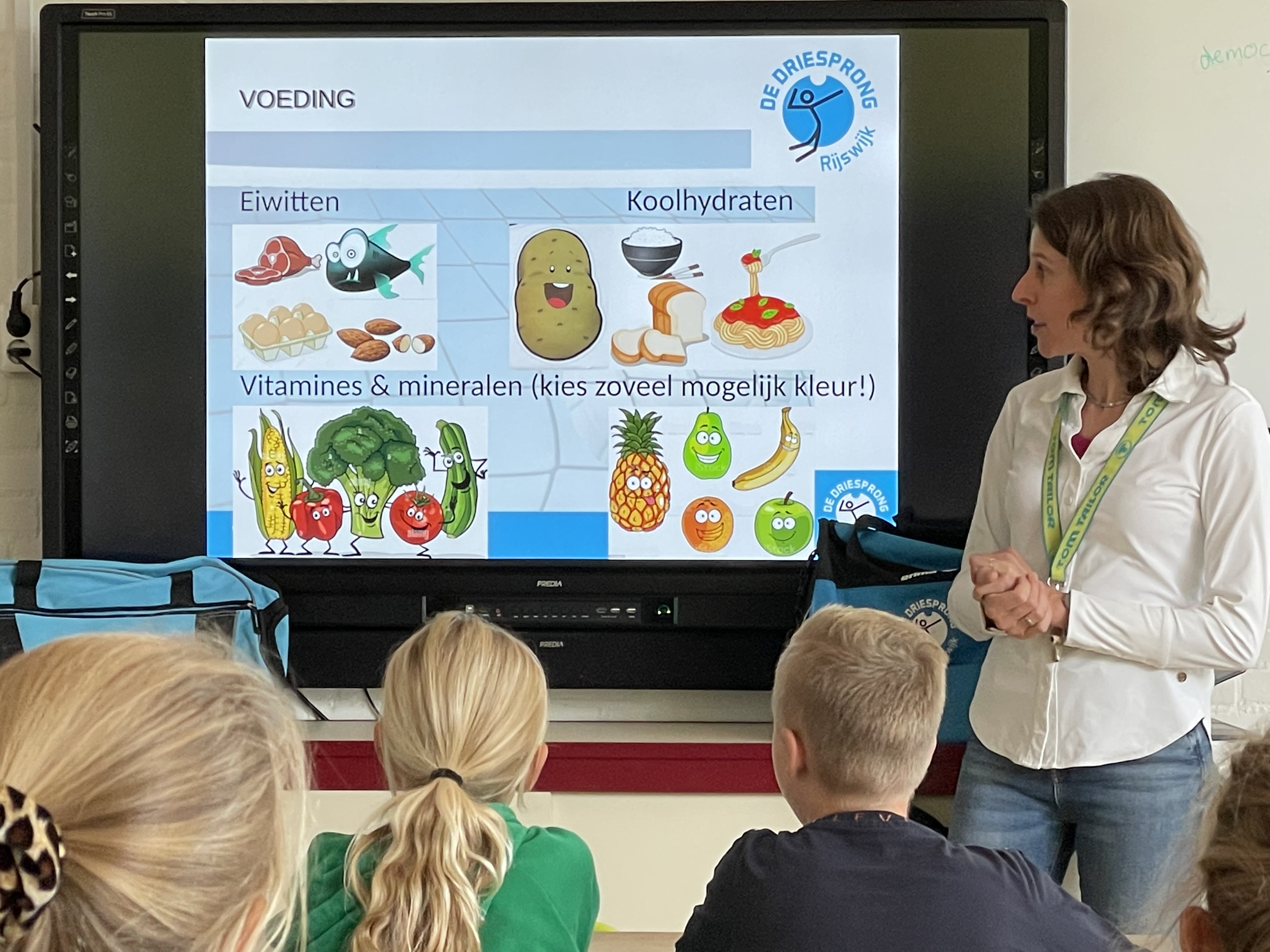Het laatste onderdeel in de klas was voeding. Wat eten topsporters, en waarom? Wat zijn vezels, mineralen, koolhydraten, onverzadigde vetten? De verrassing was groot dat je soms best een snoepje of een frikandel mocht eten, zolang je dat niet elke dag doet en daarnaast ook dagelijks fruit eet, en de bloemkool en broccoli die hun moeders 's avonds op tafel zette. De vragen bleven komen, Annet moest ze gewoon stoppen omdat we nog een leuk actief programma te gaan hadden!