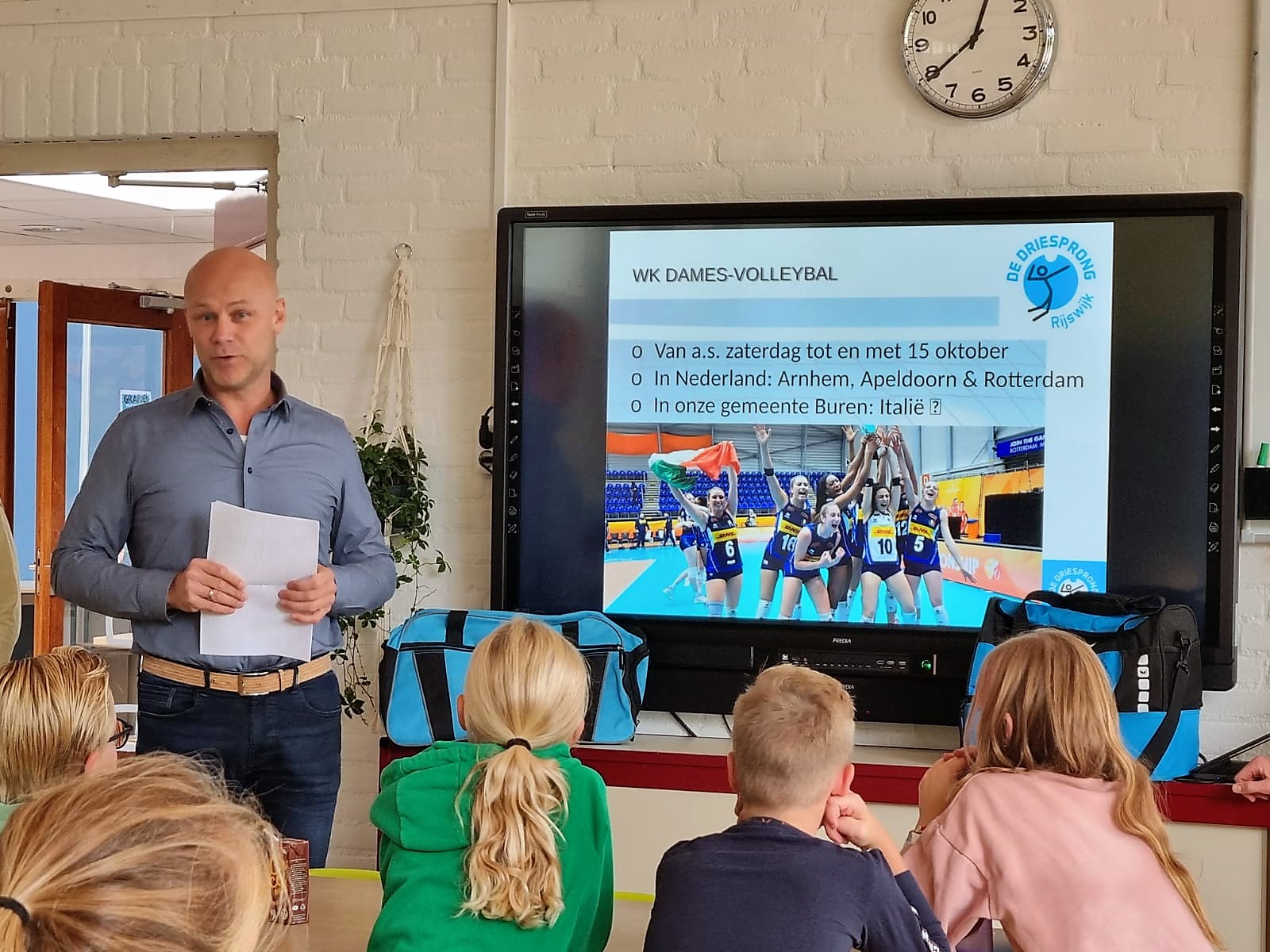 Dirk trapte als voorzitter van de Driesprong af om de volleybalvereniging voor te stellen, de buurman van OBS de Wiekslag! Hij vertelde tevens over het WK volleybal dat grotendeels in Nederland plaatsvindt, en dat het nationale Italiaanse team in onze gemeente verblijft!